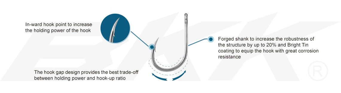 - Hook Gap Design: apertura ottimizzata per il miglior compromesso tra tenuta e ratio di aggancio